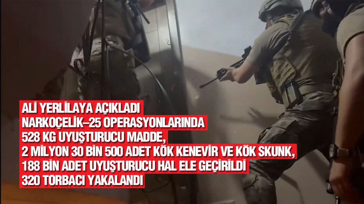 İçişleri Bakanı Ali Yerlikaya, 45 ilde düzenlenen 'Narkoçelik-25' operasyonlarında 528 kg uyuşturucu madde, 2 milyon 30 bin 500 adet kök kenevir ve kök skunk, 188 bin adet uyuşturucu hal ele geçirildiğini açıkladı! Yerlikaya, operasyonlarda 320 zehir taciri ve sokak satıcısının yakalandığını duyurdu.