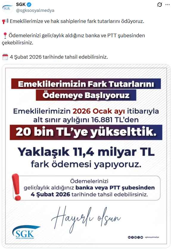 "Emeklilerimize ve hak sahiplerine fark tutarlarını ödüyoruz. Ödemelerinizi gelir/aylık aldığınız banka ve PTT şubesinden çekebilirsiniz. 4 Şubat 2026 tarihinde tahsil edebilirsiniz.”