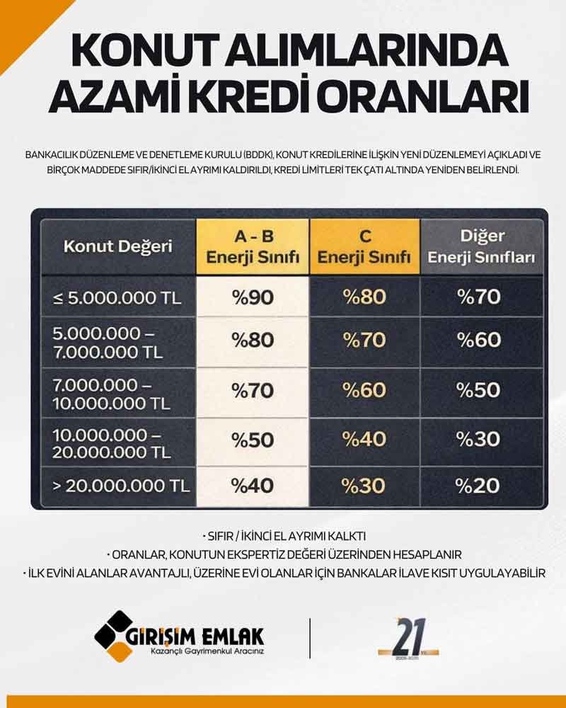 BDDK’nın yayımladığı düzenlemeye göre, tüketicilere kullandırılan konut kredilerinde kredi tutarının teminat olarak alınan konutun değerine oranında (Kredi Değer Oranı) birinci el – ikinci el ayrımı kaldırıldı. Böylece ikinci el konut alımlarında da krediye erişim kolaylaştı.