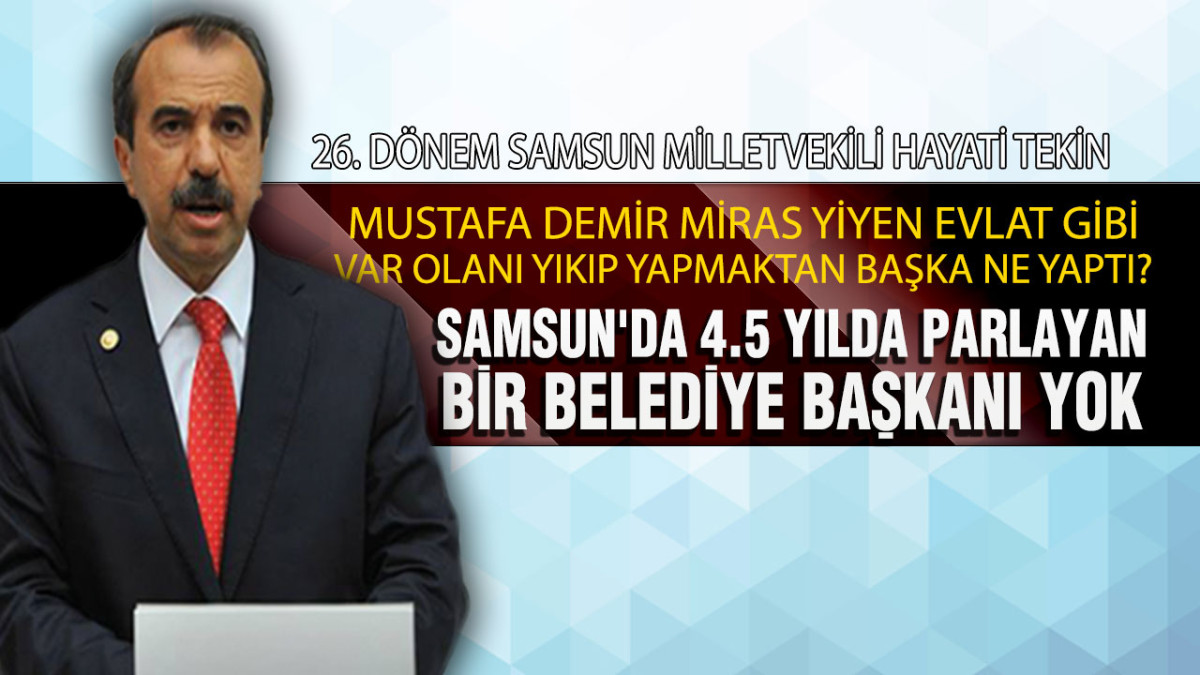 26 Dönem Samsun Milletvekili Hayati Tekin, Samsun Büyükşehir Belediye Başkanı Mustafa Demir'in yaptığı tek şeyin eski başkan Yılmaz'ın yaptıklarını yıkmak olduğunu ileri sürerken, ilçe belediye başkanları arasında parlayan bir belediye başkanının çıkmadığına vurgu yaptı.