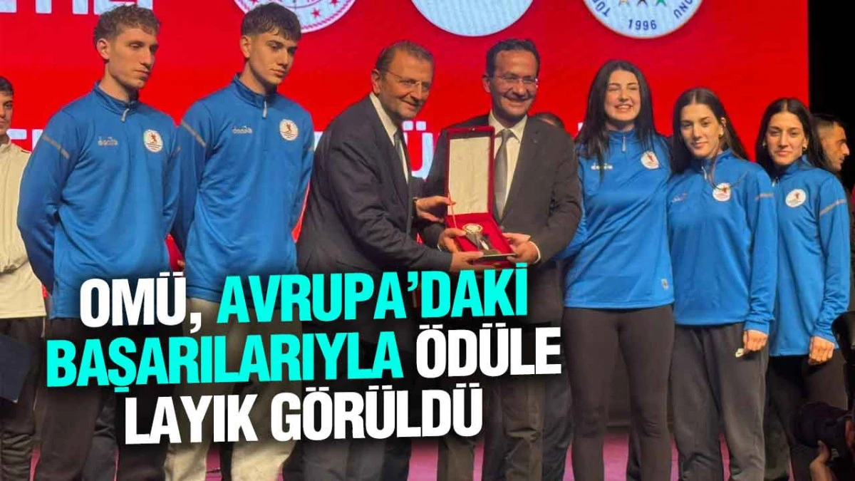 TÜSF Başkanı Türkmen tarafından takdim edilen ödül, OMÜ Genel Sekreteri Pancar ile Avrupa’da madalya kazanan sporcuların katılımıyla sahnede teslim alındı.