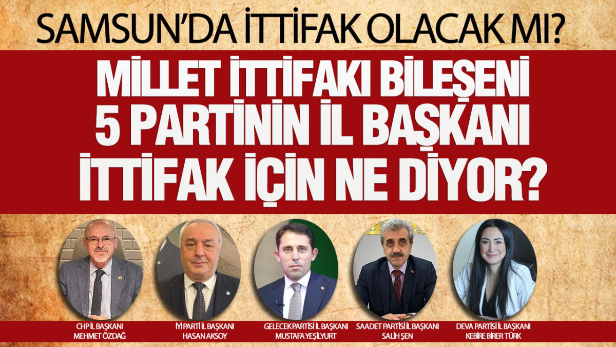 Cumhur İttifakı bileşenleri yerel seçimlerde Samsun'da ortak aday çıkartmaya hazırlanırken, Millet İttifakı bileşenlerinin duruşu merak ediliyor. Millet İttifakı'nı oluşturan 5 partinin Samsun İl Başkanları, İttifak ile ilgili açıklamalarını Samsun Etik Haber'e yaptı.
