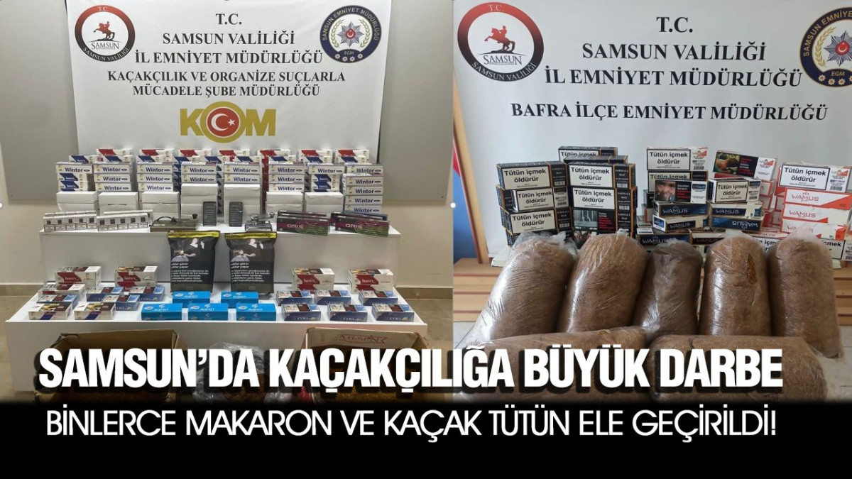 Samsun İl Emniyet Müdürlüğü Kaçakçılık ve Organize Suçlarla Mücadele Şube Müdürlüğü ekiplerinin Bafra, Atakum ve İlkadım ilçelerinde yapılan çalışmalar sonucunda, 44.600 adet makaron, 23.600 adet doldurulmuş makaron sigara, 2 adet sigara sarma makinesi, 49 kilogram kaçak tütün, 100 paket gümrük kaçağı sigara ve 2 adet gümrük kaçağı akıllı cep telefonu ele geçirildi.