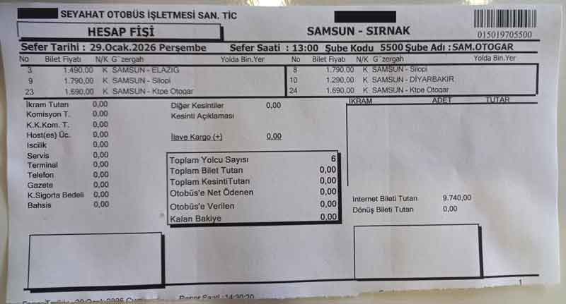 "29 Ocak tarihinde Samsun-Şırnak seferi için internetten 6 bilet sattık. Toplam tutar 9.740 TL. Bizim kazancımız %7 üzerinden 681 TL olurken, otogar yönetimi bizden %10 yani 974 TL kesti. Sadece bir işlemde 293 TL zarar ettik."