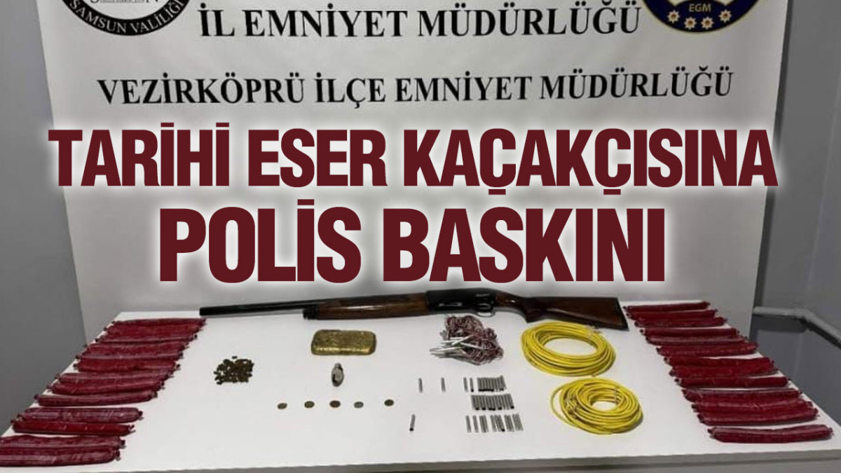 Vezirköprü İlçe Emniyet Müdürlüğü ekiplerinin takibi sonucu M.D. isimli şahsın aracında ve ikametinde yapılan aramalarda; 4 adet Roma ve Helenistik döneme ait sikke, 1 adet Osmanlı dönemine ait 10 para, 1 adet gözyaşı şişesi, 26 adet kapsüle duyarlı patlayıcı, 75 adet top barutu, 30 adet elektrikli infilak kapsülü, 38 adet infilak kapsülü, 20-25 metre saniyeli fitil, 1 adet altın sarısı renkli metal külçe, Metal detektörü kullanım klavuzu, 1 adet ruhsatsız tüfek ele geçirildi.
