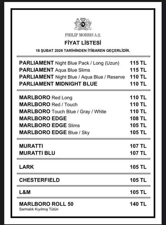 Philip Morris (PM) grubu sigara fiyatları - 18 Şubat 2026